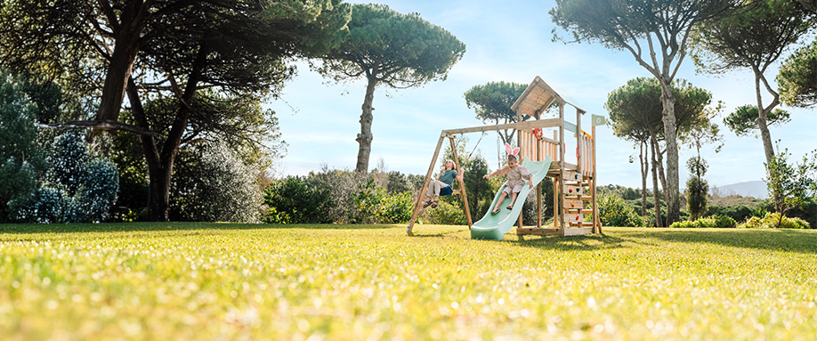 Plaats het speeltoestel in de tuin in het voorjaar of de zomer, wanneer de grond droog en draagkrachtig is. Zorg ervoor dat de toren op een vlakke ondergrond staat en dat er voldoende ruimte is voor een veilige omgeving.